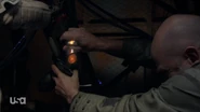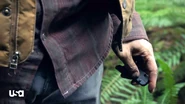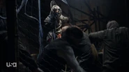 Bram sets a fire by the bombs to draw the guards away so he can steal the detonators. In the camp, Katie waits for MacGregor’s guards to run off to investigate the noise, then she, Will, Vincent and a few others run into MacGregor’s hut to ambush him. But he’s not there. Suddenly, they’re surrounded by MacGregor and his men. MacGregor feeds Vincent a line of garbage about the Bowmans being spies. Vincent doesn’t know who to follow. He wants to do the right thing, but doesn’t have the backbone for it. Finally, he caves to MacGregor, and Katie and Will are hauled away. Out in the woods in the dark, Snyder is digging through the dirt trying to find his locator when MacGregor’s guards find him. His shoe comes off as they drag him away.