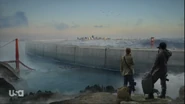 Starting outside San Francisco, where a Wall came down smack across the Golden Gate Bridge, Amy Leonard and Broussard radio in and get directions to a junkyard, where they meet up with a man who’s been living on his own for two years. He debates giving them the camp coordinates without permission from MacGregor, who he can’t reach. Shortly after he hands them over, they’re ambushed by humans in tactical gear. The man is gunned down, but Broussard and Amy slip away. The encounter rattles Broussard, who questions whether he can trust Amy. She points out she got them the camp coordinates, but the confrontation leaves her unsettled. Heading north, they cross a lake. Safe on the other side, Amy finds a pallet of propaganda that has been dropped from the sky touting “New Seattle.” As they rest by the fire, Broussard apologizes to Amy for not trusting her.